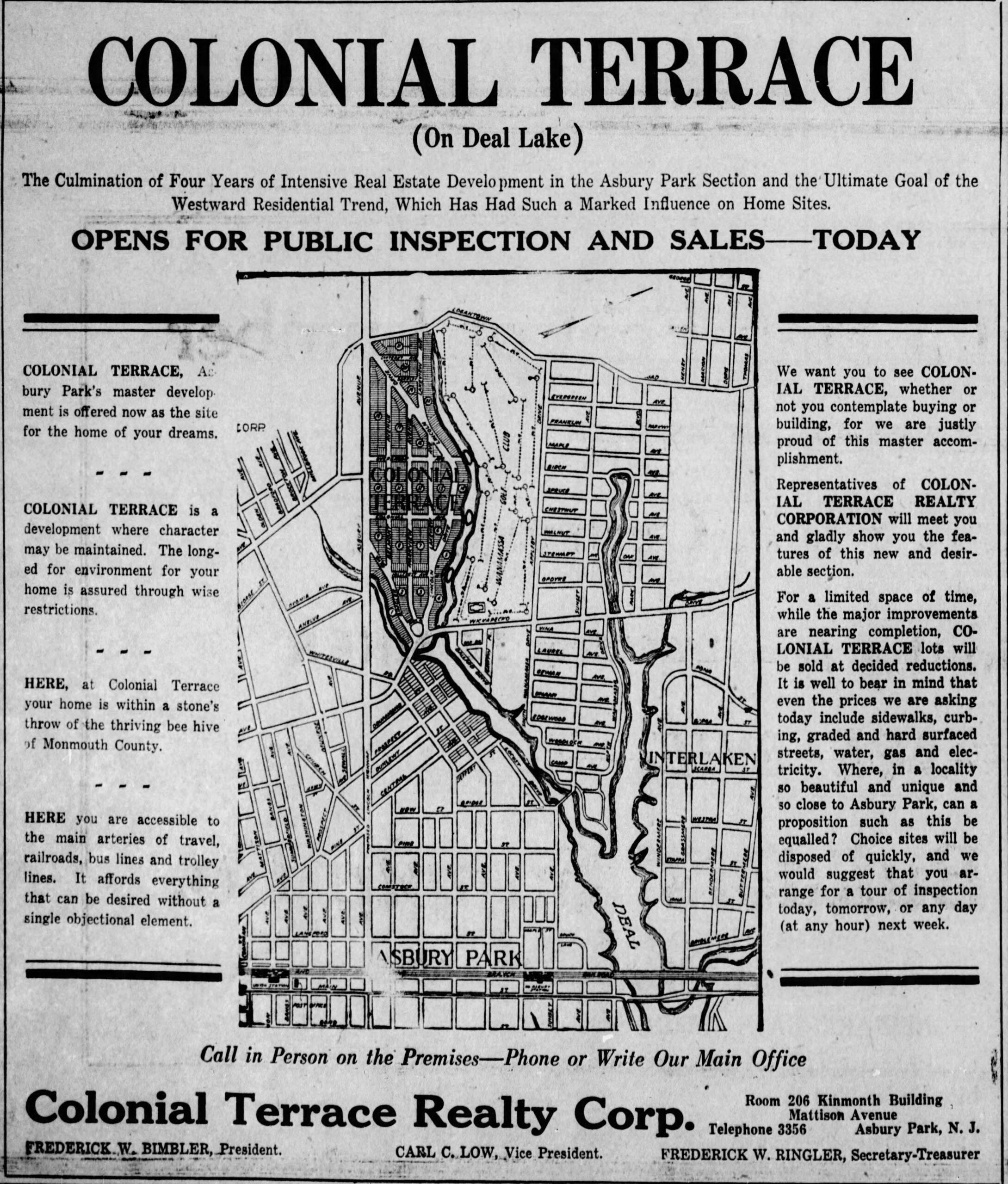 Colonial Terrace was offered as a complete alternative to Asbury Park. Lots with all the amenties and on Deal Lake.